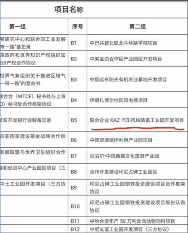 今年五月,在国家“一带一路”国际合作高峰论坛上,联合企业KAZ汽车机械装备工业园项目更是成为32个重点项目之一。